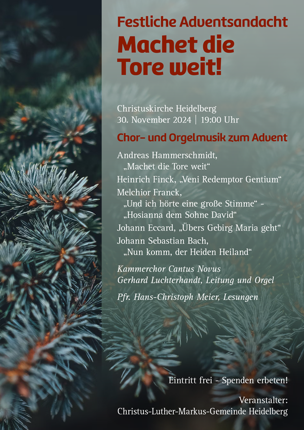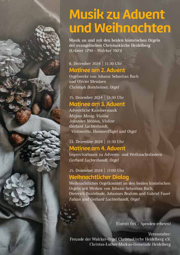 In der Adventszeit wurden vom 2.-4. Advent Chor- und Orgelmatineen angeboten und am 25.12. folgte das inzwischen schon “traditionelle” Weihnachtskonzert an zwei Orgeln mit Fabian und Gerhard Luchterhandt.