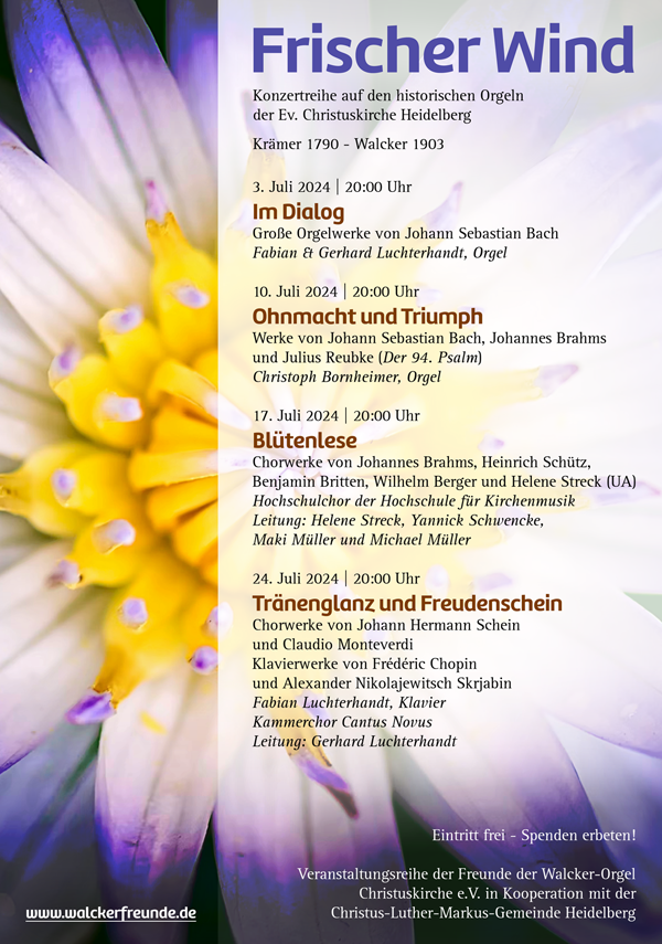 Der Titel der Sommer-Konzertreihe “Mit Wind gemalt” griff das Motto der zuvor (2012) erschienen ersten CD-Aufnahme der Walcker-Orgel, eingespielt von Gerhard Luchterhandt, auf.