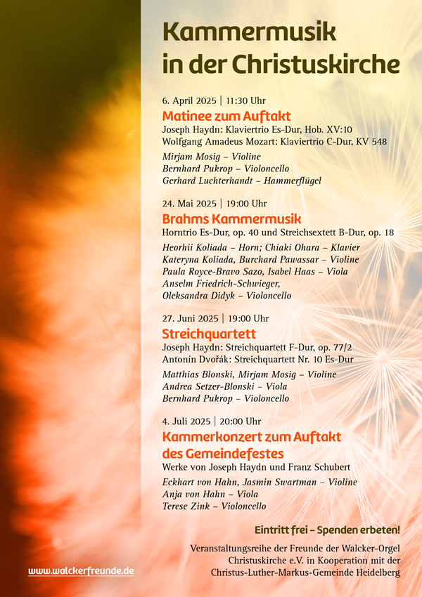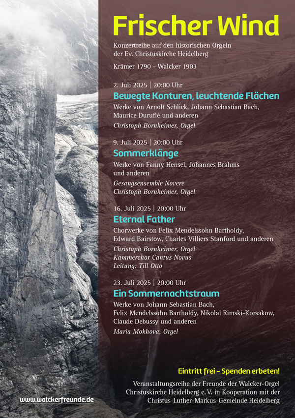 Aktuell laden wir Sie zu unserer sommerlichen Orgelreihe sowie zum dritten und viertten Konzert unserer diesjährigen Kammermusikreihe in der Christuskirche ein: